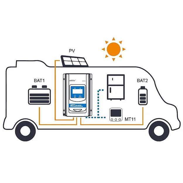 DuoRacer MPPT kontroler punjenja dizajniran je za istovremeno punjenje dvije baterije (prikazane kao BATT1 i BATT2 dolje) istovremeno u solarnom sustavu. Ovaj kontroler podržava tipove baterija s više životnih vijeka (BATT1), uključujući Sealed, Gel, Flooded, LiFePO4 i Li-NiCoMn, koji su prikladni za kamionere, kamione, čamce itd.